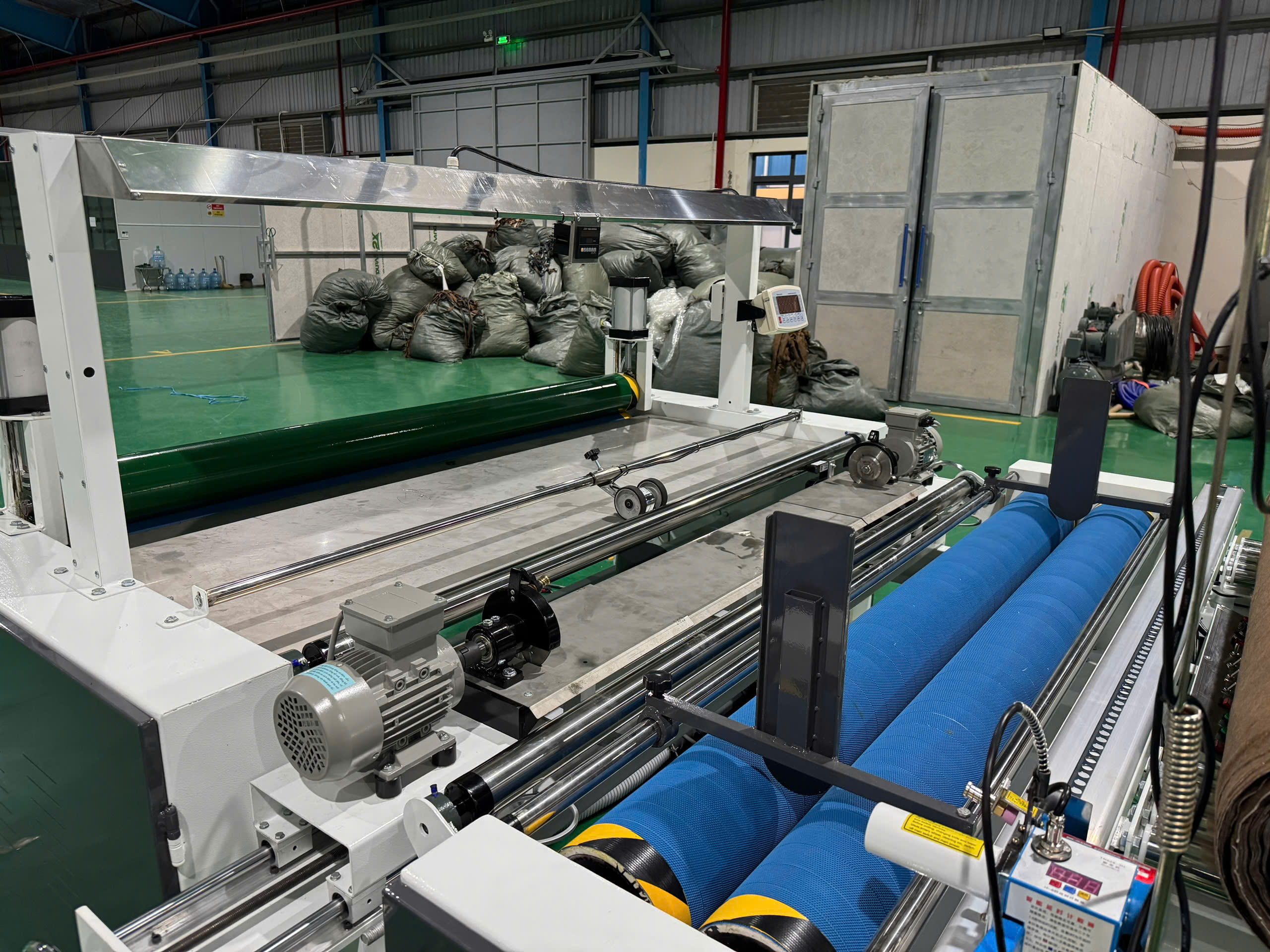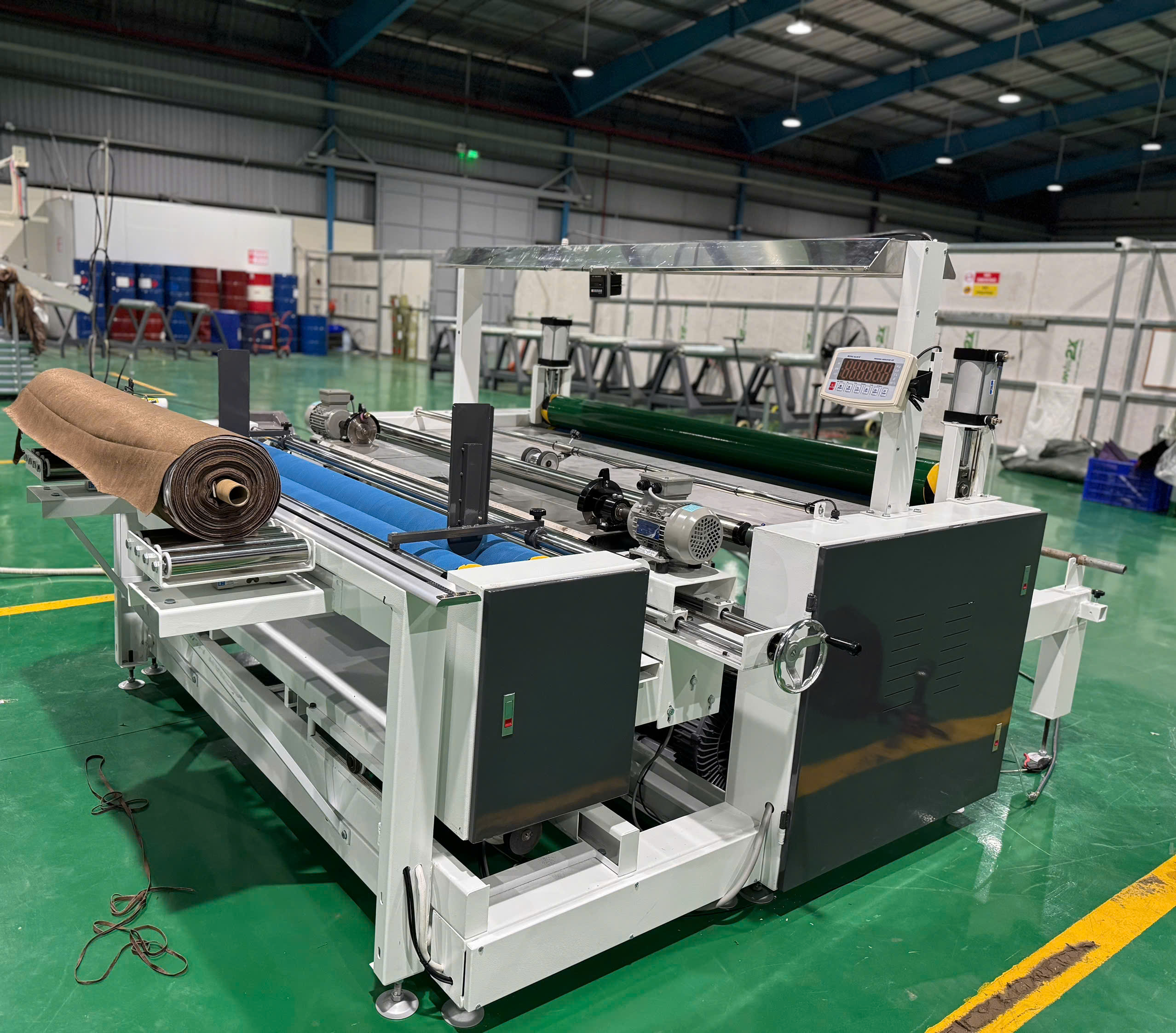 Tích hợp cắt thẳng (sử dụng máy cắt đầu bàn), kết hợp cân trọng lượng cuộn vải sau hoàn thiện.